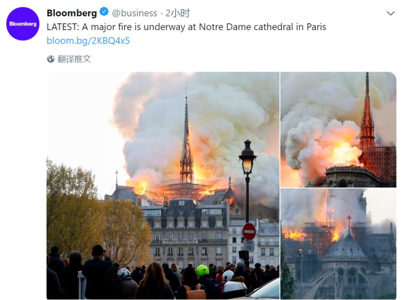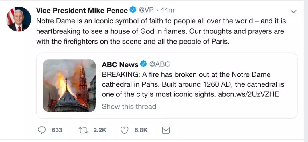 美国副总统彭斯发推文表示,这是“全世界人民信仰的象征”,“令人心碎”。