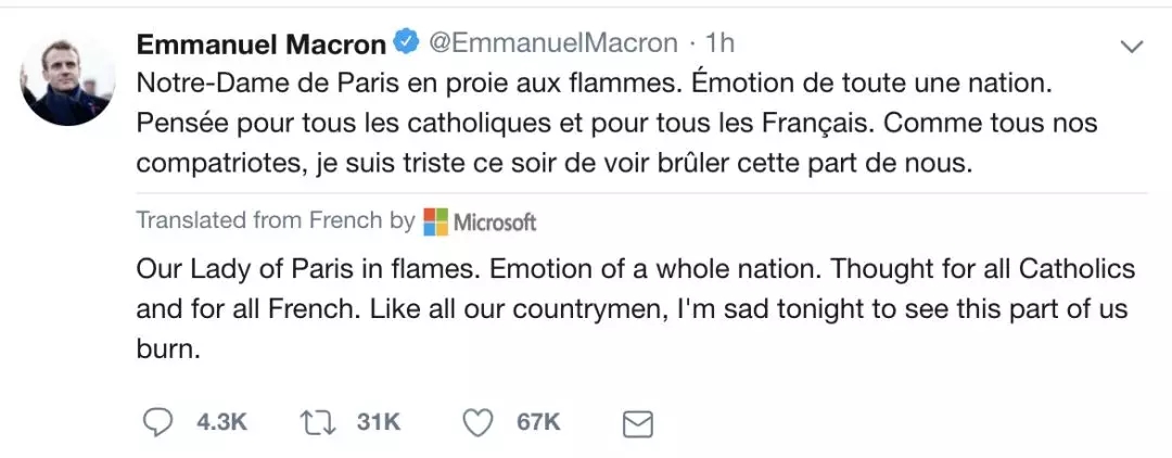 法国总统马克龙因为这场大火,取消了原定于当天关于“黄马甲”抗议的全国讲话,并发推称:“巴黎圣母院的火连接着整个国家的情感。我的挂念和所有天主教徒及所有法国人在一起。今晚,我的心与所有的同胞同在,今晚看到巴黎的一部分被烧,痛彻心扉。”