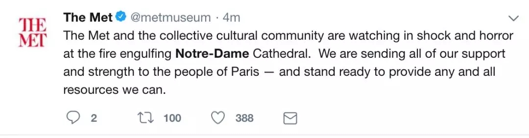纽约大都会博物馆Met发文缅怀这一艺术界的心碎悲剧,“我们为这一收藏和艺术界的巨大悲剧心碎。希望早日修缮,大都会博物馆将会全力支持帮助圣母院度过难关,尽力提供帮助和资源。”