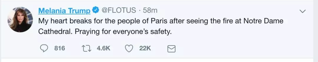 美国总统川普夫人Melanie Trump也发推文称“为巴黎圣母院心碎,为人民的安全祈祷。”