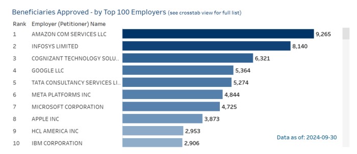 根据2024财年数据,提供H-1B签证数量排名前十的雇主分别是: