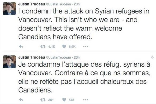 警方、当地政府部门,以及穆斯林社区对该起事件相当关注,一位在温哥华长大的居民认为这带给难民一种错误的信息,同时也给加拿大抹黑。总理特鲁多在社交网站上发文谴责,指事件绝对不能反映本国对接受叙利亚难民的态度。移民部长麦家廉指出,施袭者的行为应受到谴责,事件同时侮辱了本国与加拿大人的价值观,并与本国及各个社区对欢迎叙利亚难民的理念背道而驰。社区对难民的欢迎不会因为事件而减退,反而会因此变得更热切。卑诗省长简蕙芝则指袭击不能接受,呼吁所有人共同谴责有关行为,并希望公众一起欢迎加国新成员。温市市长罗品信则表示,用袭击来表达仇恨,手法低劣,温哥华绝对不会容忍。