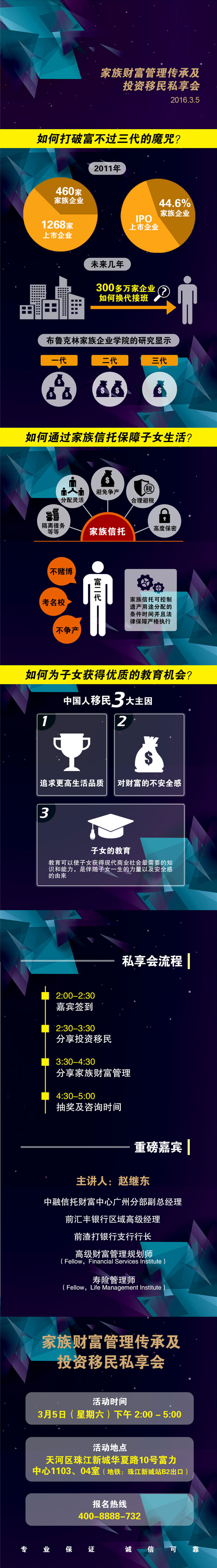 3月5日(星期六), 集团携手中融国际信托将举办“家族财富管理传承及投资移民私享会”,届时将邀请重磅嘉宾:中融信托财富中心广州分部副总经理赵继东先生为大家分享如何管理传承家族财富,以及 首席资深顾问花艳小姐,讲解投资移民的趋势及动态。席位有限,请即致电:400-8888-732留座。