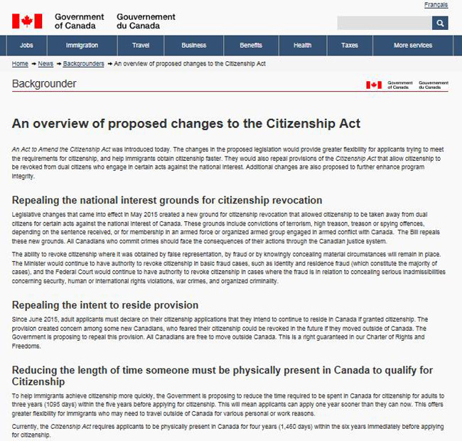 之前的C-24号法案规定,对于双重国籍者,如被法庭裁定参与恐怖主义活动、间谍罪或叛国罪,罪名一旦成立,联邦政府则有权撤销此人的加拿大国籍。新修订案则去除了有关条款,宣布加拿大政府无权取消公民的加拿大国籍。发现申请人在申请公民身份的过程中造假,才是政府唯一能取消公民身份的理由。