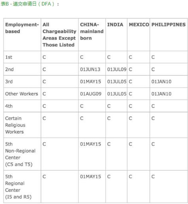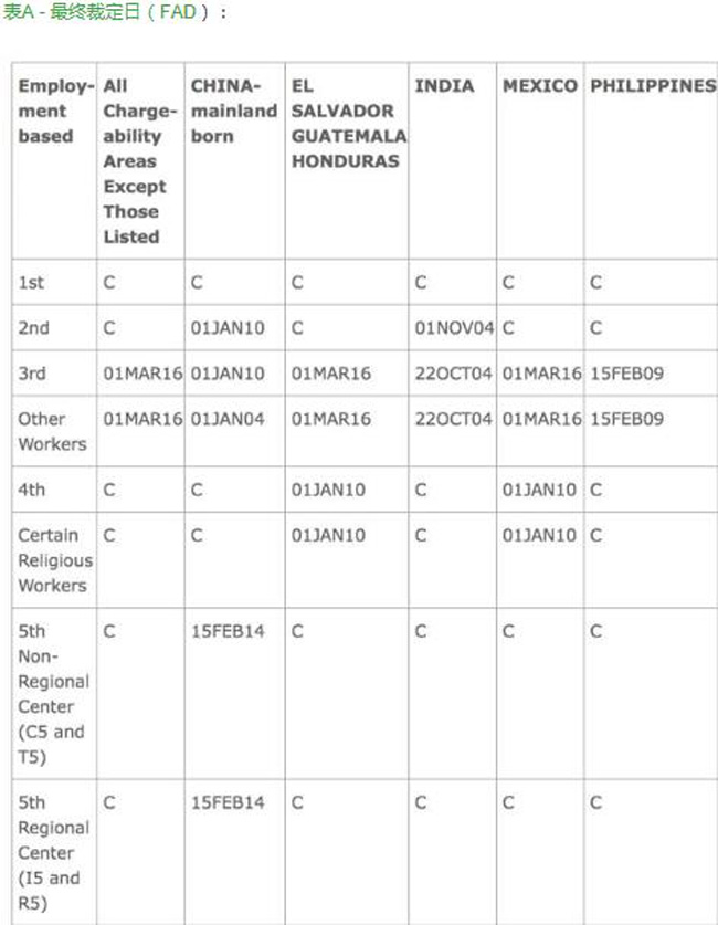 上面是两张排期表,有两个截止日。表A是最终裁定日(FAD),表B是递交申请日(DFA)。表A最终裁定日的截止日停滞不前,而表B递交申请截止日一般会保持不变,但这取决于移民局的态度。按照老规矩,移民局将在一周之内公布按照表A还是表B来接受I-485的申请。
