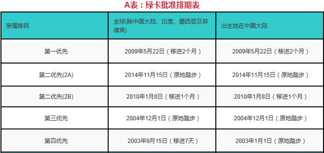 A表:绿卡批准排期表