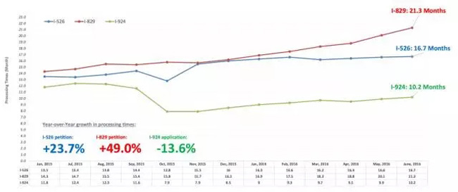 上图显示,在过去一年,I-829的审批平均时间为17个月。