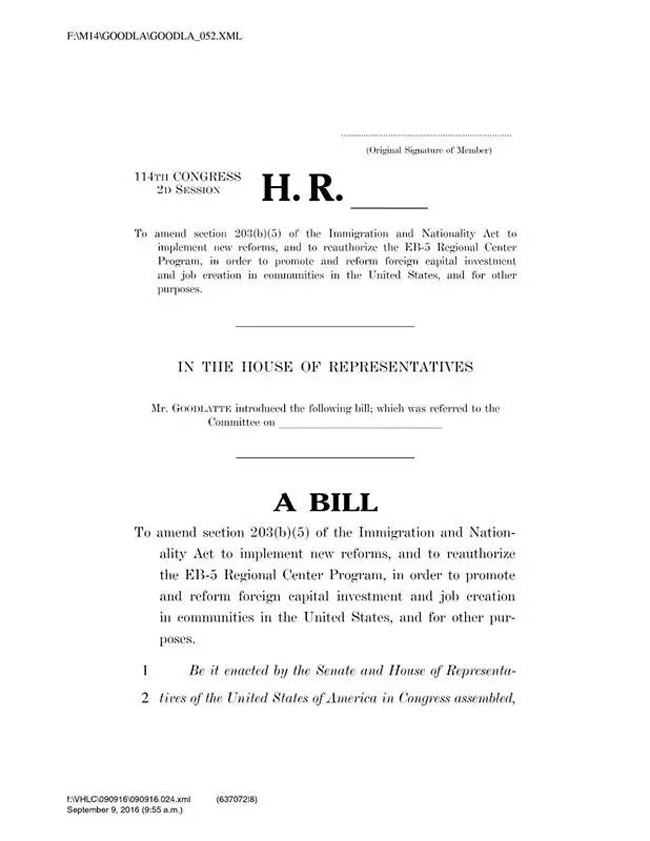 美国当地时间9月9日,EB-5投资移民新提案重磅出炉!据悉,这份新提案由来自众议院司法委员会主席Goodlatte主导,名称为:American Job Creation and Investment Promotion Re-form Act of 2016(2016美国就业创造及投资促进改革法)。