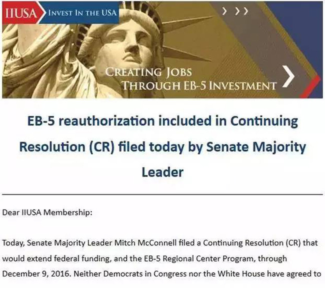 由于EB-5区域中心政策包含了在本财年的财政拨款法案中,若国会最终通过此持续性决议,EB-5区域中心政策也将自动被短暂顺延到本年底12月9日。因此现在可以非常肯定地说,EB-5区域中心计划已经搭上顺风车,如同去年一样,能否顺利延期取决于国会两党对于政府预算的政治博弈,下周参议院的投票基本就能见分晓。