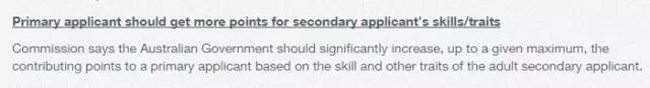 按照委员会的计划,申请人配偶和成年子女的英语能力、工作能力、年龄和教育程度应该被纳入评估标准。据委员会称,几乎一半的技术移民签证发放给了第二申请人,因此这些评估极端重要。