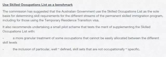 委员会建议,在确定永久性移民项目,甚至包括发放临时居留过渡签证时,要将SOL作为唯一的基准。委员会建议澳洲政府对所有技术移民均采用积分制,并且建议,如果主要申请人有雇主的担保,可以获得额外加分。当前,技术移民和雇主担保移民申请的选择标准有所不同。