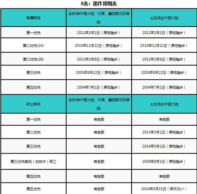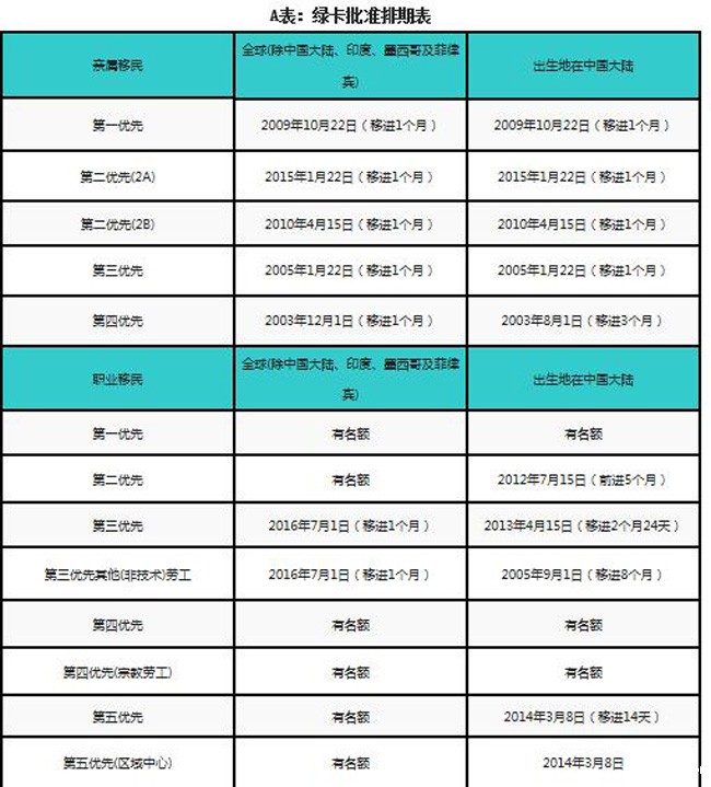 亲属移民的“绿卡批准排期”,港澳台及中国大陆出生申请人大多数是同步前进1个月。具体情形如下: