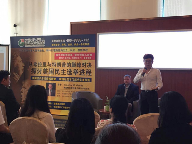 2016年10月26日,在中国银行广东省分行和美国常春藤高中联盟两大协办单位的鼎力支持下, 集团隆重举办了名为“从希拉里与特朗普的巅峰对决探讨美国民主选举进程”的主题分享会。由于这是一次具有重大意义的活动,因此吸引了不少对子女教育相当关心以及对当前美国选举和留学趋势颇有见解的各界人士前来参与。