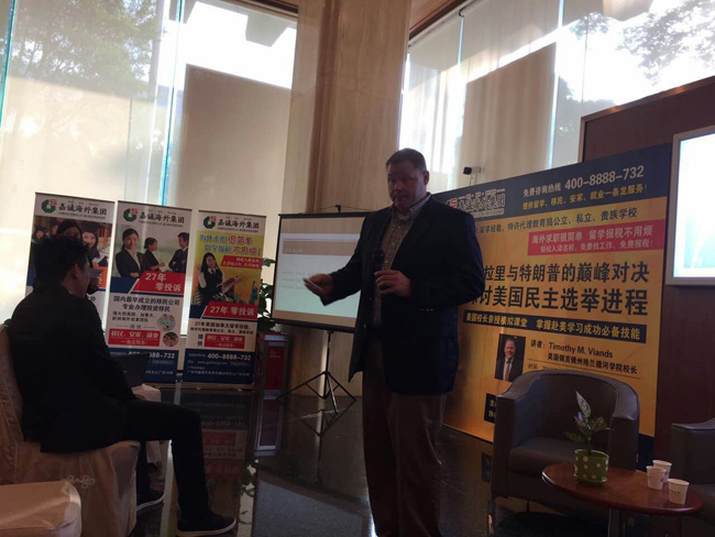 而随着留学生数量越来越多,大家到底应该如何从中脱颖而出呢?借此疑问,我们隆重邀请了远道而来的美国俄亥俄州格兰德河学院校长Timothly M. Viands。Timothly校长认为,这个世界每天在发生改变,学生应该在时代变迁下为自己做出最佳选择。如今,美国的留学生里面大部分是中国学生。我们所看中的学生,分数并不是最重要的,反而是他知道应该如何承担重要的领导角色!而学生申请美国学校是重要的步骤,所以在这过程中必须要展示出自己有到美国读书的强烈愿望!