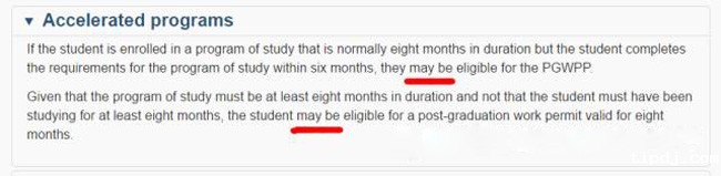 不过,针对这条规定也有例外情况。如果该课程长度设置为8个月,且念该专业的学生也基本都是读了8个月才休完所有课程,而对于少部分只花了6个月就达到了该专业毕业要求的尖子生,移民局还是很认可的,至少移民局允许这些“尖子生”去申请为期8个月的毕业工签,前提是,能证明你的专业课程长度真的被设置为8个月。