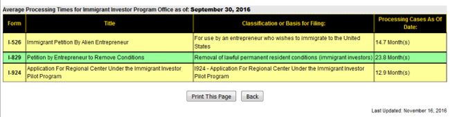 I-526有所加快,而I-829和I-924均稍有放缓。对于申请人来说,I-526审理周期加长并不一定是件坏事。因为子女年龄在I-526审理期间是被冻结的,也就是说,I-526审理周期越长,对申请人子女的影响就越小。但是想提醒投资者,要注意身份维持:I-829的审批速度现在已经一直维持在一年多了。对于有条件绿卡持有人来说,一旦I-829审批过程超过一年,需要提前,在USCIS的infopass系统预约或者直接去附近的移民局办事处预约面谈,让移民局官员在自己的护照上加盖I-551的章,以确保能证明自己在I-829审核期间的绿卡身份。