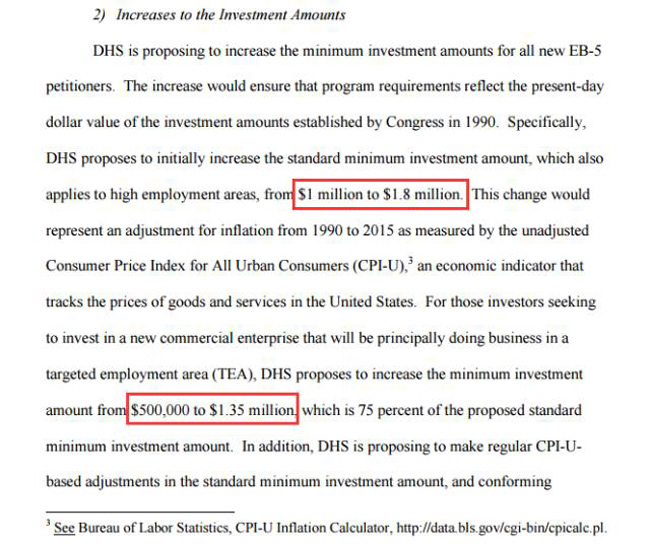 DHS建议将非TEA从100万美元涨到180万美元(上涨率为80%);TEA从50万美元涨到135万美元(上涨率为170%)。此外,还建议从法规生效后,每5年根据城市消费者物价指数CPI-U对投资金额进行调整。