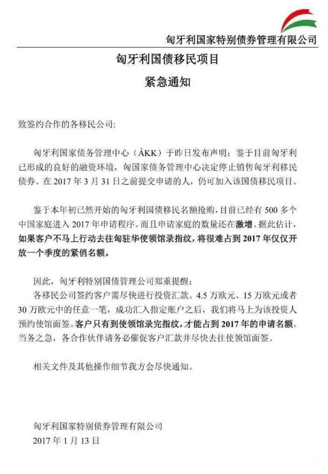 据必威中文官网电话欧洲分公司提供的消息,匈牙利国家特别债券管理有限公司1月13日发布紧急通知,国债移民项目再次收紧,确定提前至一季度关停,将于2017年3月31日正式收官!