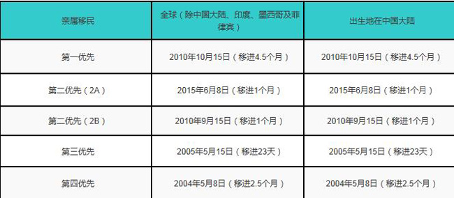 亲属移民4月“递件排期表”与3月相同,中国大陆出生申请人所有类别均原地踏步。