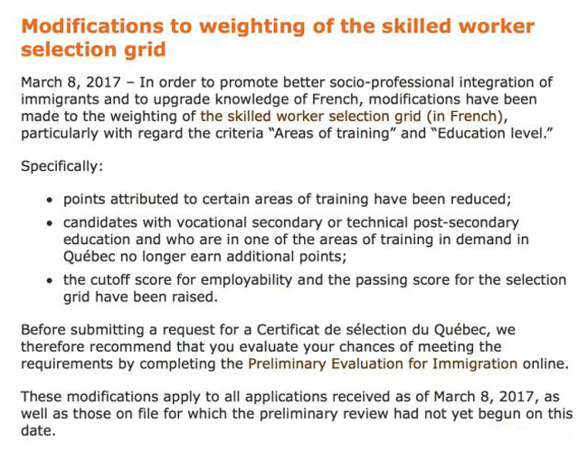 温哥华分公司提供的消息,当地时间3月8日,魁北克技术移民算分系统进行了重大改变,不仅影响尚未递交的申请,还将影响到已经递交但初审尚未开始的申请人。新的计分规则即日生效!