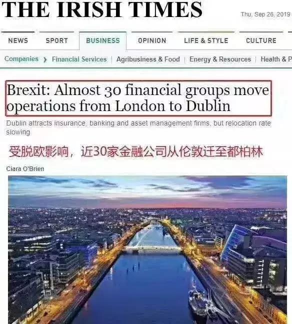 爱尔兰当地时间2019年9月26号,The Irish Times消息称,受到英国脱欧影响,有近30家金融公司纷纷将运营中心从伦敦迁至都柏林。