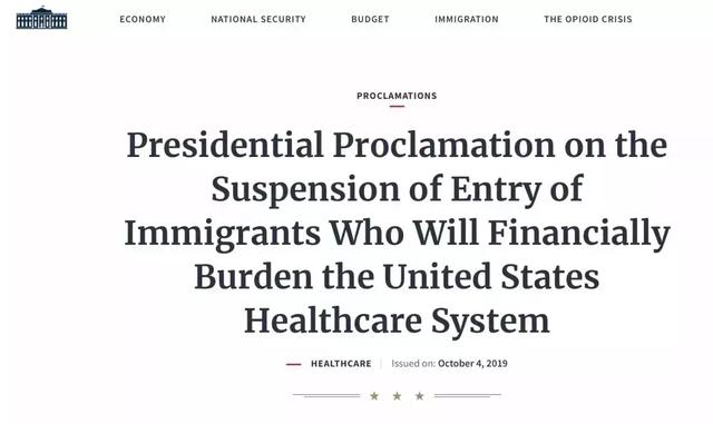 公告公布一项新规定:移民签证申请者须证明在进入美国30天之内会获取认证医保或有财力支付合理预见的医疗费用,在满足这些条件后才会获得移民签证。