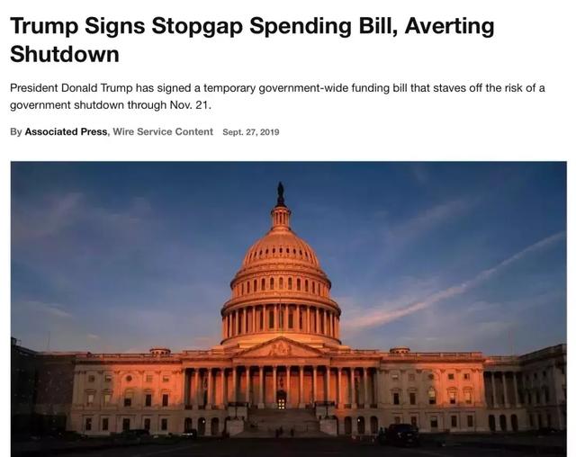 美国当地时间9月27日(周五),川普签署此前参众两院通过的continuing resolution(临时预算案),将联邦预算延期至2019年11月21日。