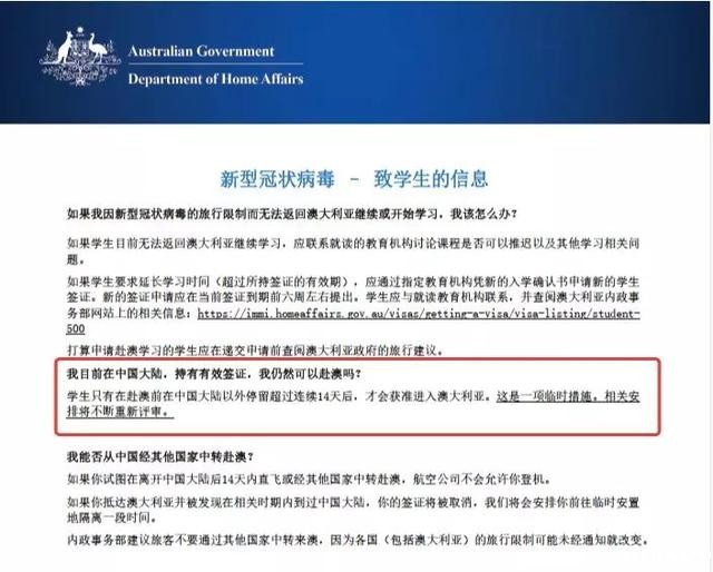根据移民局更新的文件上所说,学生只有在赴澳前在中国大陆以外停留超过连续14天后,才会获准进入澳大利亚。