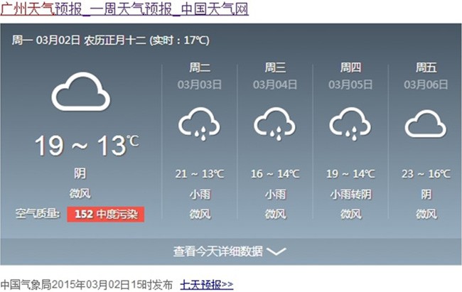 食物安全有问题,我们可以选择买外国进口的有机食品;饮水受污染,我们可以只喝外国的纯净矿泉水;可是当空气受到严重污染,我们无法不呼吸。还记得春节期间被雾霾笼罩的广州吗,蓝天白云似乎只能在记忆中寻找。抬头望一下天,冷空气的突如而至让广州的天变得阴阴沉沉。查一下天气预报,今天(3月2日)的空气质量是152中度污染。