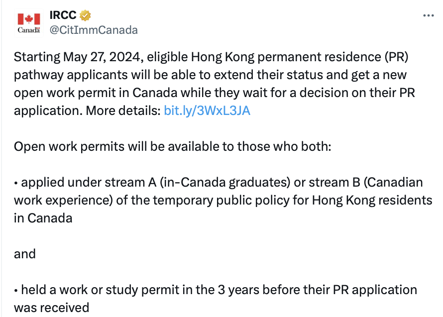 新政表示,自2024年5月27日起,由加拿大移民局2021年特别通道申请永久居留(PR)的香港居民可以延长他们的居留状态,并且可以申请加拿大开放式工签。