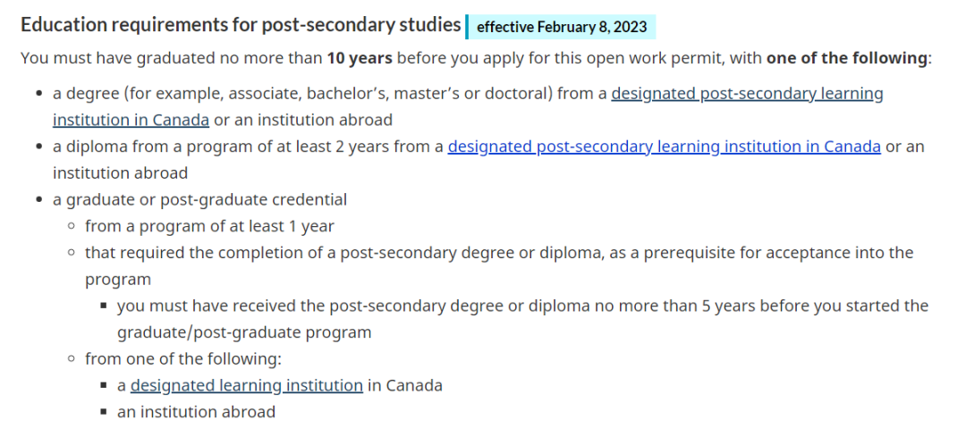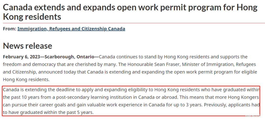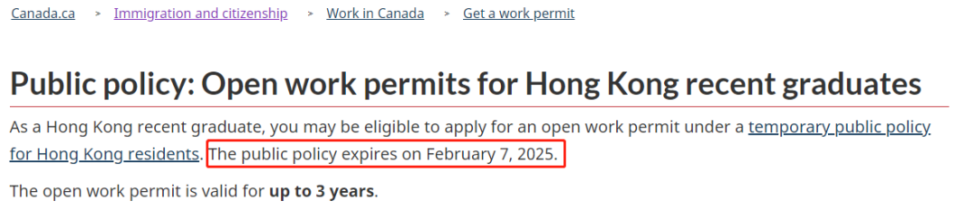 该项计划原定于2023年2月7日到期,但去年加拿大移民局宣布, 将该项计划延长至2025年2月7日 ,同时放宽申请条件,申请人如在过去10年内毕业于加拿大或国外专上教育机构,并取得有关学位/文凭,便有资格提出申请(原来要求是过去5年内毕业)。