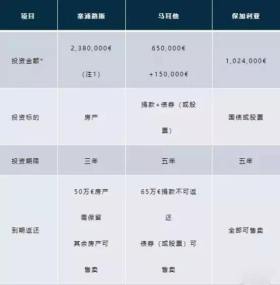 * 塞浦路斯和马耳他的最低投资额如本表,保加利亚的最低投资额为融资方式27万欧元