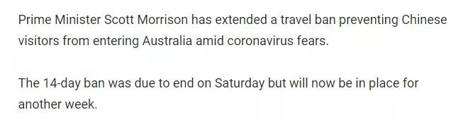 澳洲政府证实,总理已经正式宣布延长在2月15号到期的,临时14天入境限制令,继续延长所有从中国旅行的非澳大利亚居民的旅行禁令。