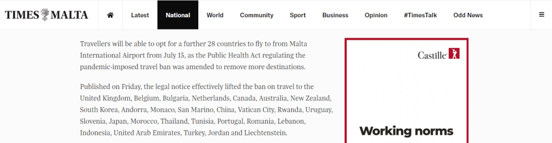 据马耳他时报最新消息,“安全旅行国家”新增28国,其中包括中国。7月15日起,马耳他对中国开放边境,无需隔离和出示任何特殊许可即可入境。
