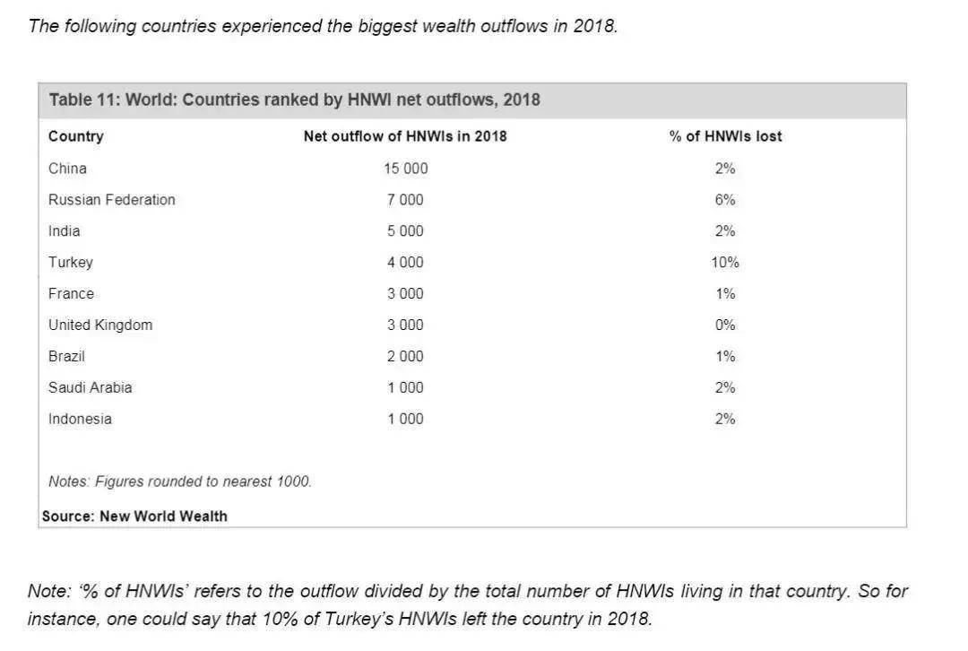 据亚非银行与New World Wealth共同发布的《2019年全球财富迁移报告》显示,全球持有的私人财富总额约为204万亿美元。全球财富移民在2018年加速,2018年大约有108,000名富裕人士迁移,而2017年为95,000名。