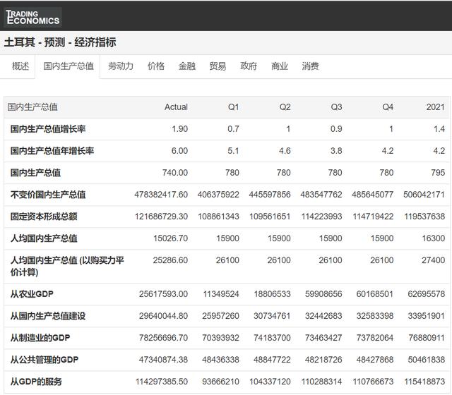 根据《交易经济学》全球宏观模型和分析师的预期,到本季度末,土耳其的GDP年增长率预计将达到5.1%。展望未来,从长期来看根据我们的计量经济学模型,预计土耳其的GDP年增长率将在2021年达到4.2%左右。