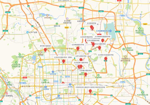 目前,北京外籍人员子女学校在北京的分布如下图所示,主要集中在北京的东部和东北部区域。