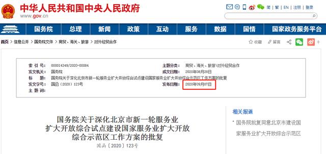9月7日,国务院发布了关于深化北京市新一轮服务业扩大开放综合试点建设国家服务业扩大开放综合示范区工作方案的批复。