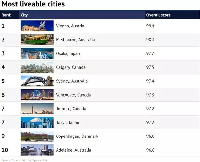 8月14日,经济学人智库(EIU)公布“2018全球宜居城市排行榜”,奥地利首都维也纳击败连续7年居首的澳洲墨尔本,成为排行榜有史以来首个登顶的欧洲城市。EIU的全球宜居城市排行榜收录了140个城市,考核指标为稳定性、健康医疗、文化与环境、教育以及基础建设等五项。从整体数据看,发达国家的中小型城市总体的表现要比大城市要好。全球宜居城市前十名:1.维也纳;2.墨尔本;3.大阪;4.卡尔加里;5.悉尼;6.温哥华;7.多伦多;7.东京(并列);9.哥本哈根;10.阿德莱德。