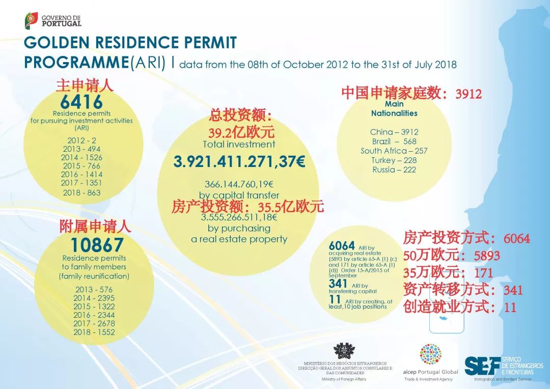 葡萄牙移民局(SEF)官方发布了截止到2018年7月31日黄金居留获批的最新数据。(1)累计投资额:目前为止,葡萄牙黄金居留许可项目总投资额约为39.21亿欧元,其中房地产贡献约为35.55亿欧元。(2)主申获批人数:7月份有47位主申请人获批,累计总共6416位投资人成功获批黄金居留许可。(3)附属申请人数:7月份有74位附属申请人成功获批,黄金居留许可累计附属申请人数为10867人。(4)投资者来源:在目前6416位获批的投资者中,中国有3912人(占比约61%)。