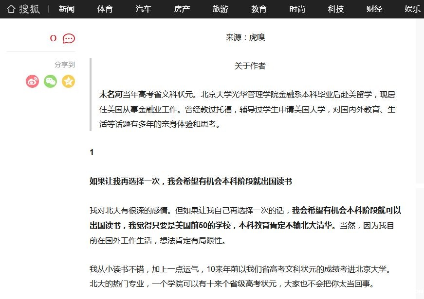前不久一篇采访北大毕业后又去美国留学的高考状元的文章引起了公众关注,该留学生表示:“如果让我自己再选择一次的话,我会希望有机会本科阶段就可以出国读书,我觉得只要是美国前50的学校,本科教育肯定不输北大清华。”
