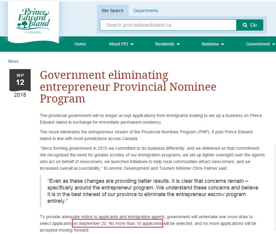 当地时间9月12日,加拿大PEI省政府正式发出通告,将永久关闭该省企业家移民项目。另外,会在9月20日安排最后一次抽签,最多选出10名申请者。取而代之的将是先拿工签,创业后再转永居的类别。新的申请人将不会以直接获得永久居民身份落地,而是需要在本地经营公司满一年,并且证明公司是可以健康持续发展经营下去后才可以申请身份。