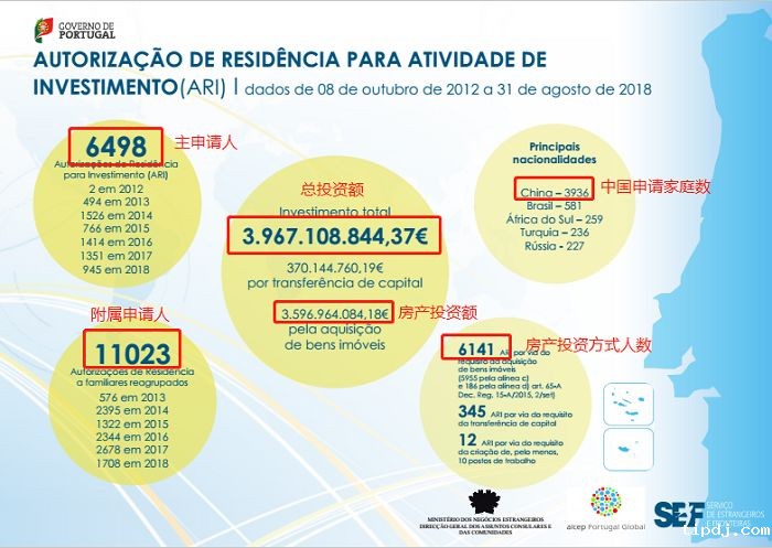葡萄牙移民局(SEF)官方发布了截止到2018年8月31日黄金居留获批的最新数据。累计投资额:目前为止,葡萄牙黄金居留许可项目总投资额约为39.67亿欧元,其中房地产贡献约为35.97亿欧元。主申获批人数:8月份有82位主申请人获批,累计总共6498位投资人成功获批黄金居留许可。附属申请人数:8月份有156位附属申请人成功获批,黄金居留许可累计附属申请人数为11023人。投资者来源:在目前6498位获批的投资者中,中国有3936人(占比约61%)。