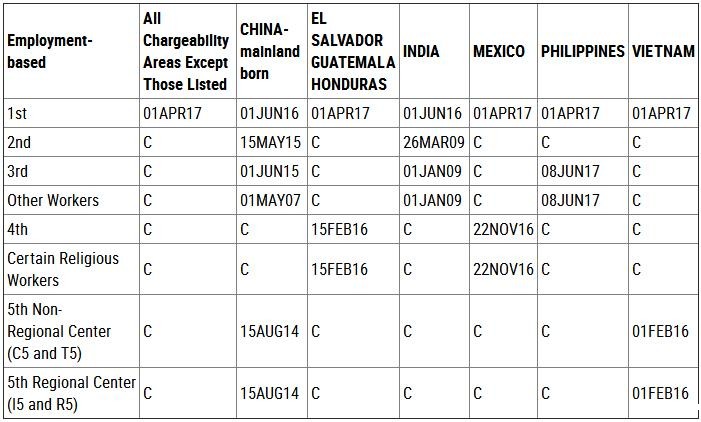 当地时间10月11日,美国国务院签证办公室发布了11月的签证排期公告,EB-5签证排期截止日维持在2014年8月15日,表B则停滞在2014年10月1日。亲属移民“绿卡批准排期”,中国申请人的情况为——F-1类:由2011年6月1日前进至2011年6月22日;F-2A类:由2016年8月22日前进至2016年9月15日;F-2B类:由2011年11月22日前进至2012年1月1日;F-3类:由2006年6月15日前进至2006年7月8日;F-4类:由2005年2月15日前进到2005年3月22日。职业移民“绿卡批准排期”,中国申请人的情况为——EB-1维持在2016年6月1日;EB-2由2015年4月1日前进至2015年5月15日;EB-3维持在2015年6月1日;EB-4有名额;EB-5维持在2014年8月15日。