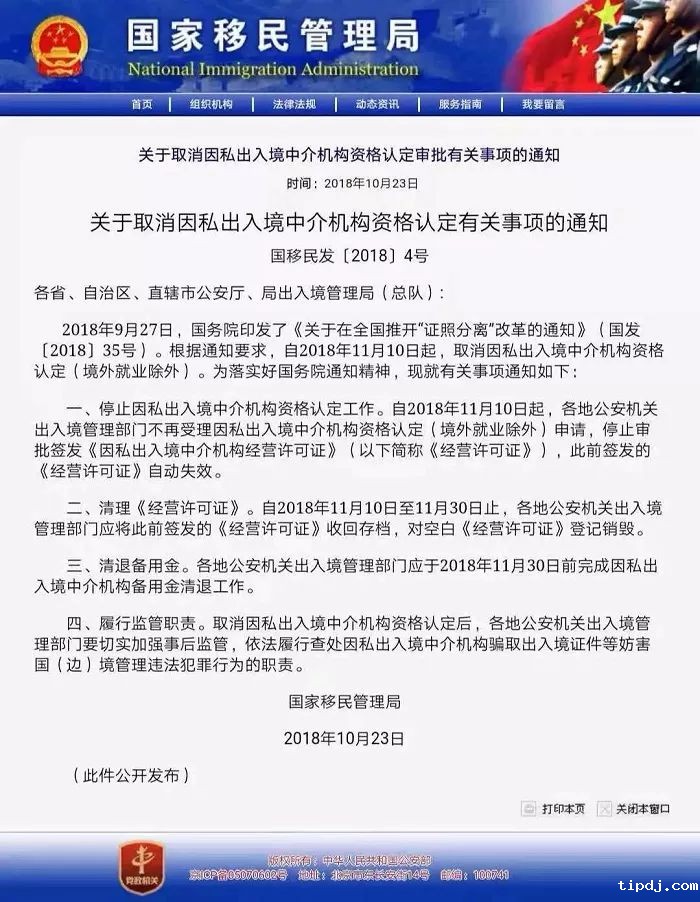 据国家移民管理局最新消息,自2018年11月10日起,各地公安机关出入境管理部门不再受理因私出入境中介机构资格认定(境外就业除外)申请,停止审批签发《因私出入境中介机构经营许可证》。至此,实施近18年的移民中介资格准入制度将成为历史。