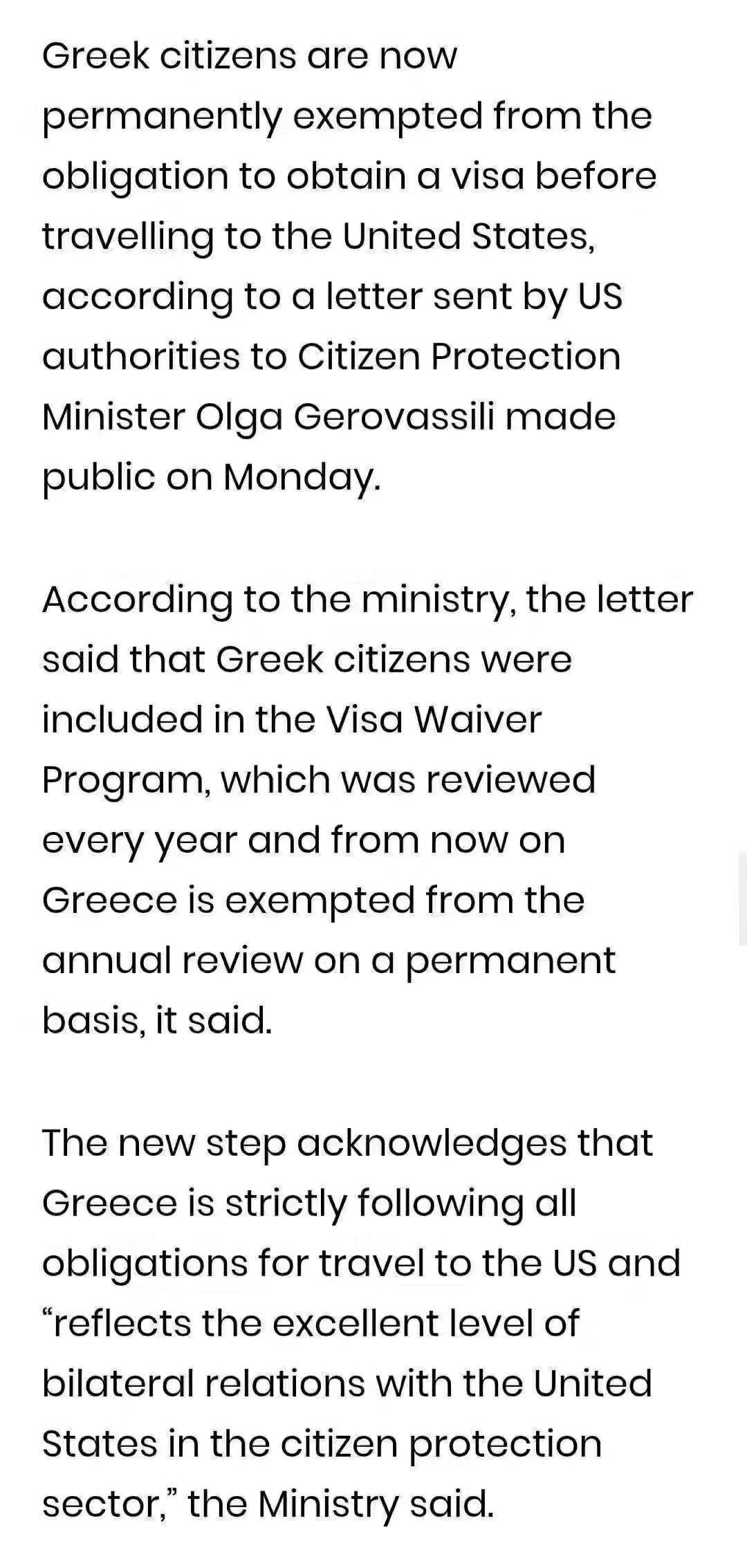 美国政府日前致信希腊公民保护部长奥尔加.杰罗瓦西里,表示希腊公民被永久性地列入美国免签计划,希腊护照持有人赴美无需签证可停留90天。信中指出,希腊是美国免签计划的成员国之一。该计划每年都要接受审查,在美国认为某个国家的公民可能不遵守免签证计划的限制要求时,该国的免签资格将被随时撤销。但从目前开始,希腊可以永久性免除年度审查。