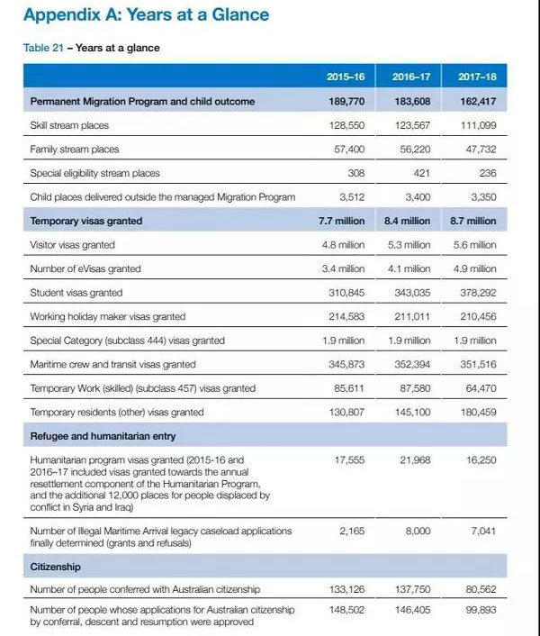10月20日,澳洲内政部发布了2017-2018年度的财政报告,当中的要点为:完善技术移民的各个标准和要求;对技术移民的专业性和年龄有全新的规划;对新移民的英语水平有严格要求;重视雇主担保移民的真实可靠性;将新移民迁移到偏远地区。财政报告中也曝光了以下数据:(1)2017-2018财年PR配额是19万,但实际PR发放数量仅有162,417个,与上一财政年相比,数量下降了12%;(2)入籍申请标准提高后,2017-2018财年的入籍批准人数为80,562个,比上一财政年减少了41.5%;(3)临时签证审批量提高,主要集中在旅游签和学生签两项签证类别,而临时签证发放总量为870万,比上一财政年增加30万;(4)除了PR发放量和入籍审批量削减以外,2017-2018财年澳洲政府一共取消了57,440个签证,有的签证被吊销是因为递交的材料涉嫌造假,主要是留学生签证。还有一些是因为携带了违禁品入境,被海关直接吊销签证并遣返。