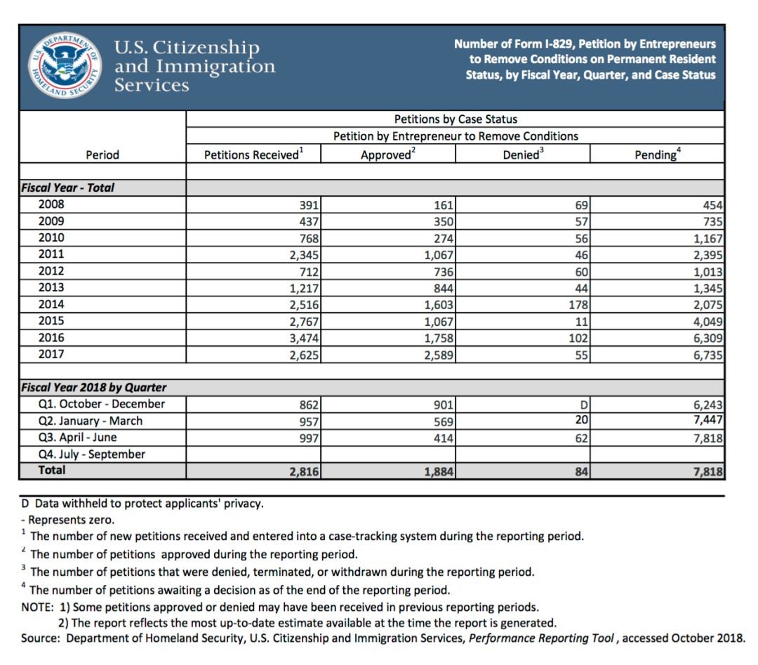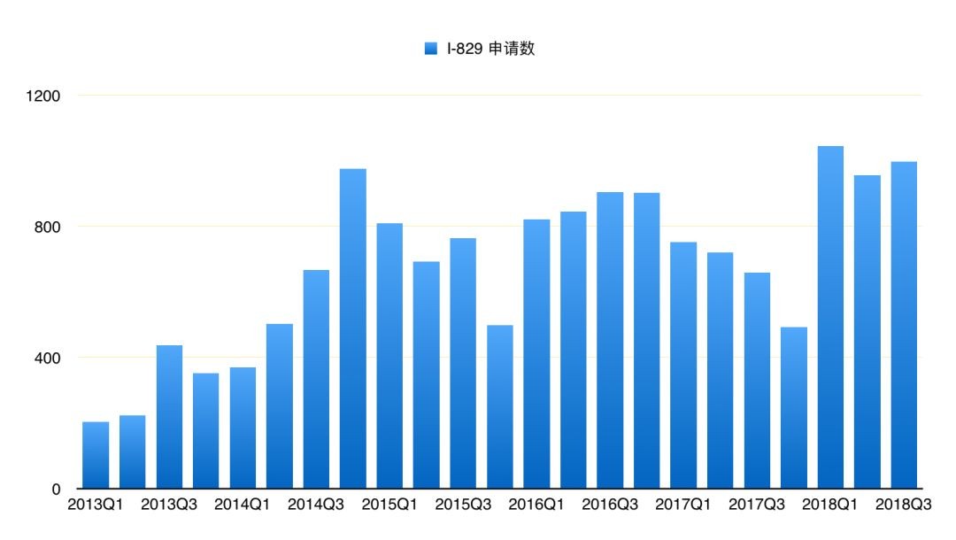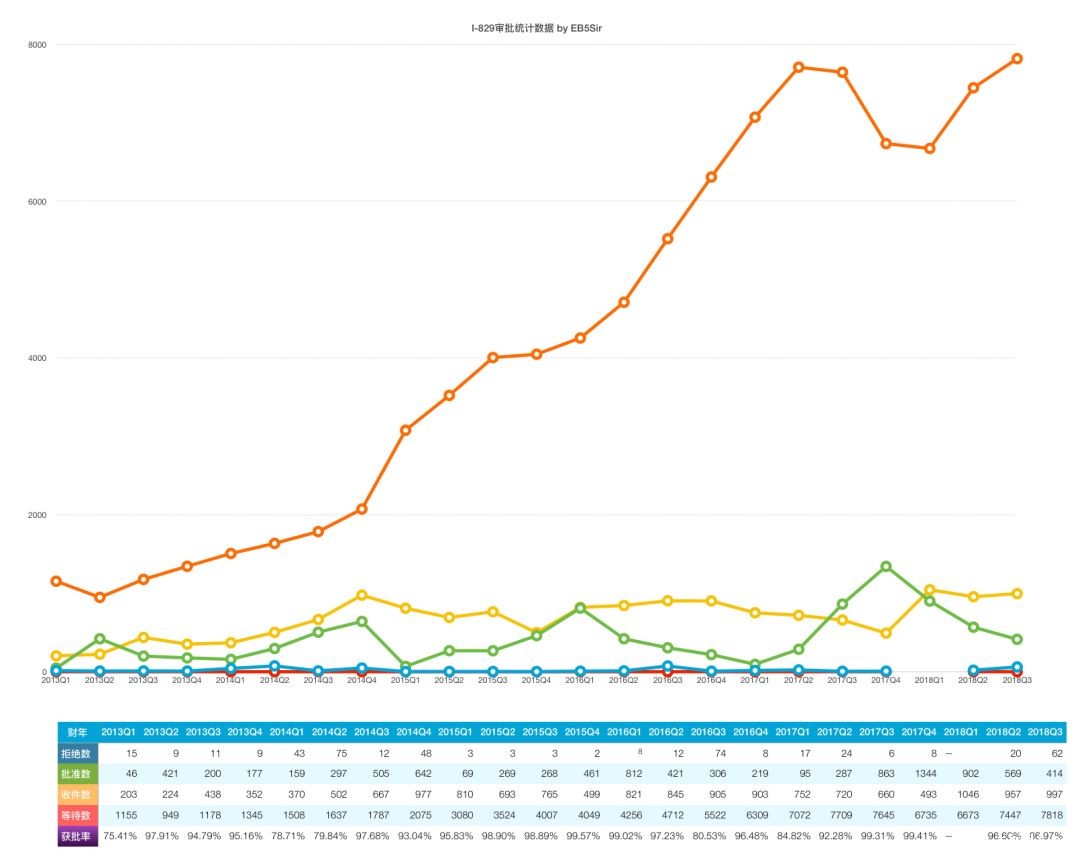 再来看看I-829,这一季度:申请数为997,比上一季度增加了40;审批数为414,比上一季度减少了155;拒件数为62,比上一季度增加了42;积压数为7,818,比上一季度增加了371。