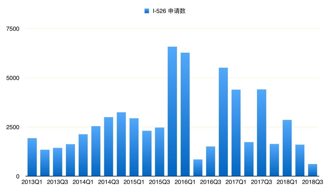 I-526申请数:终于,全球的EB-5申请量都下来了,在2018年3月份,改革未果之后,整个EB-5申请量都下来了。
