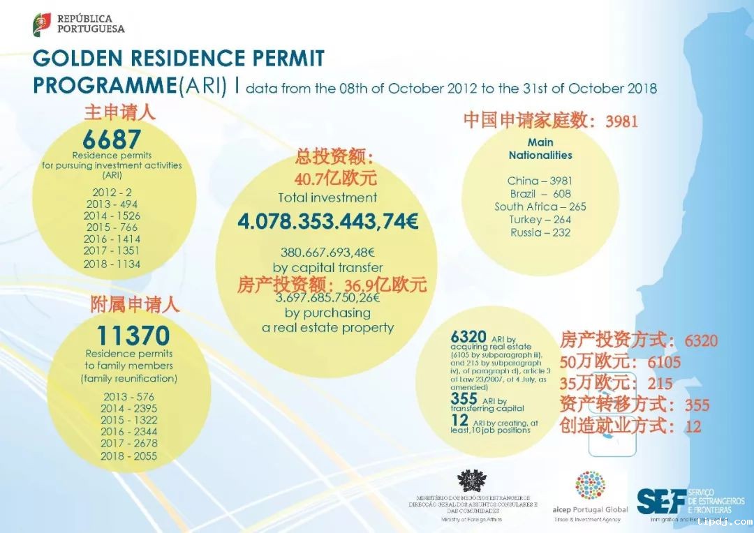 葡萄牙移民局(SEF)官方发布了截止到2018年10月31日黄金居留获批的最新数据。累计投资额:目前为止,葡萄牙黄金居留许可项目总投资额约为40.78亿欧元,其中房地产贡献约为36.97亿欧元。主申获批人数:10月份有125位主申请人获批,累计总共6687位投资人成功获批黄金居留许可。附属申请人数:10月份有245位附属申请人成功获批,黄金居留许可累计附属申请人数为11370人。投资者来源:在目前6687位获批的投资者中,中国有3981人(占比约60%)。